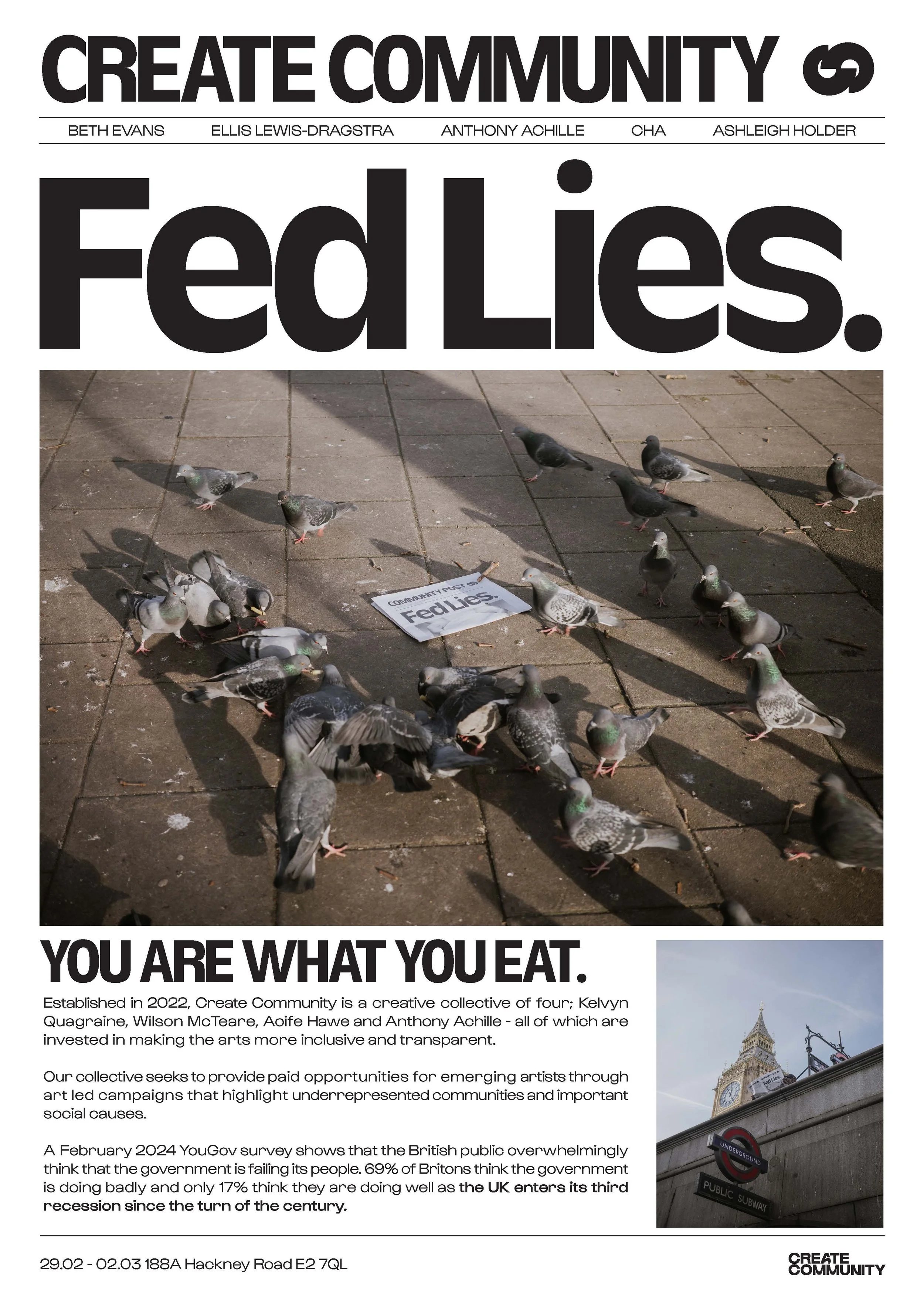 Our most recent campaign ‘Fed Lies’ focussed on challenging misconceptions around food insecurity in the UK whilst raising money for Open Door Community Kitchen. FED LIES EXHIBITION Anthony Achille CHA Ellis Lewis-Dragstra Beth Evans
